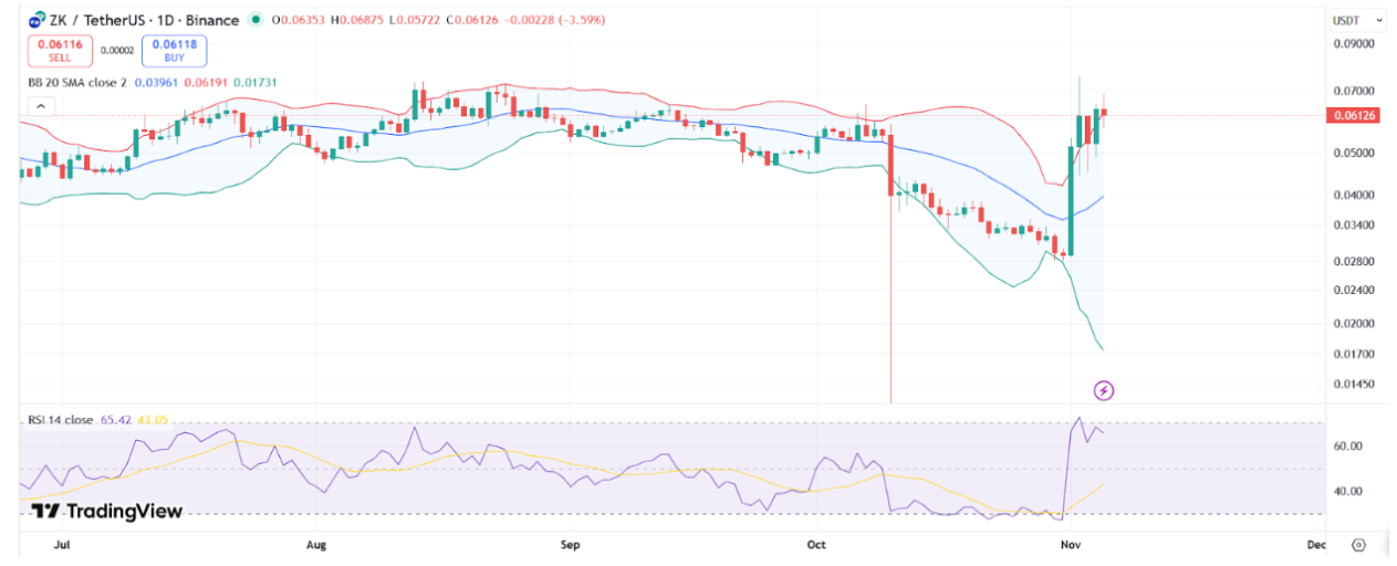 On the daily chart, ZK price has surged above the mid Bollinger Band, signaling renewed bullish momentum after months of consolidation. The upper band, around $0.0687, acts as the immediate resistance.