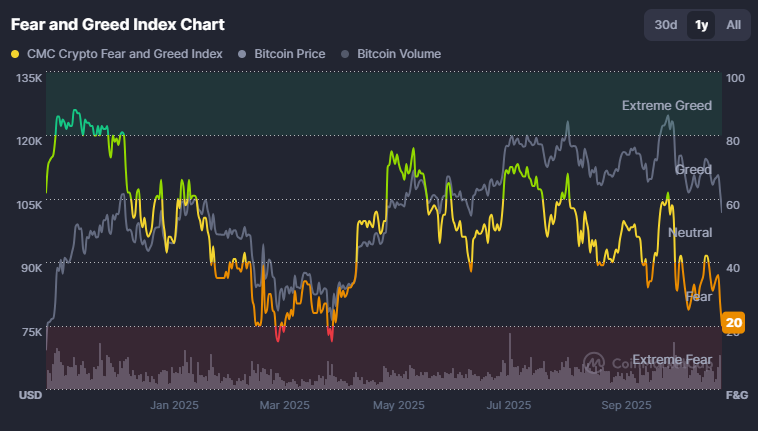 The crypto market has undergone a severe correction over the past 24 hours, resulting in approximately $2 billion in liquidations. Consequently, the CoinMarketCap Crypto Fear & Greed Index dropped to a seven-month low of roughly 20/100. This level of extreme bearish sentiment has not been seen since April 2025.