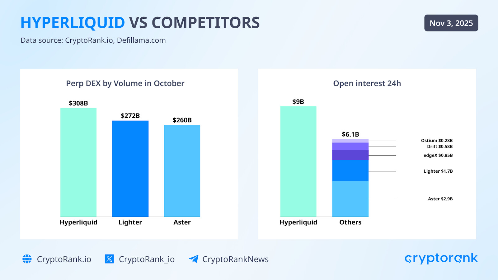 The October market crash served as a stress test, showcasing Hyperliquid’s robust infrastructure, which stayed fully operational during mass liquidations. Lighter and Aster grew fast, but we’ll have to see if they can keep it up in the long run, as they rely on incentivized traffic (both have points programs, while Hyperliquid doesn’t).