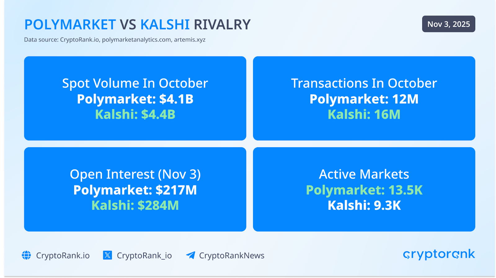 Now, let’s break some numbers. Kalshi hit $4.4B in volume vs Polymarket’s $4.1B. The gap is pretty small, compared to September, when Kalshi was a clear winner – $2.9B vs $1.6B. Again, most of Kalshi volume comes from sports, whereas Polymarket has it distributed among several categories: sports, politics, and culture. Kalshi also leads in transaction count: 16M vs 12M. As of November 1, it’s Polymarket’s $200M in open interest against Kalshi’s $296M.