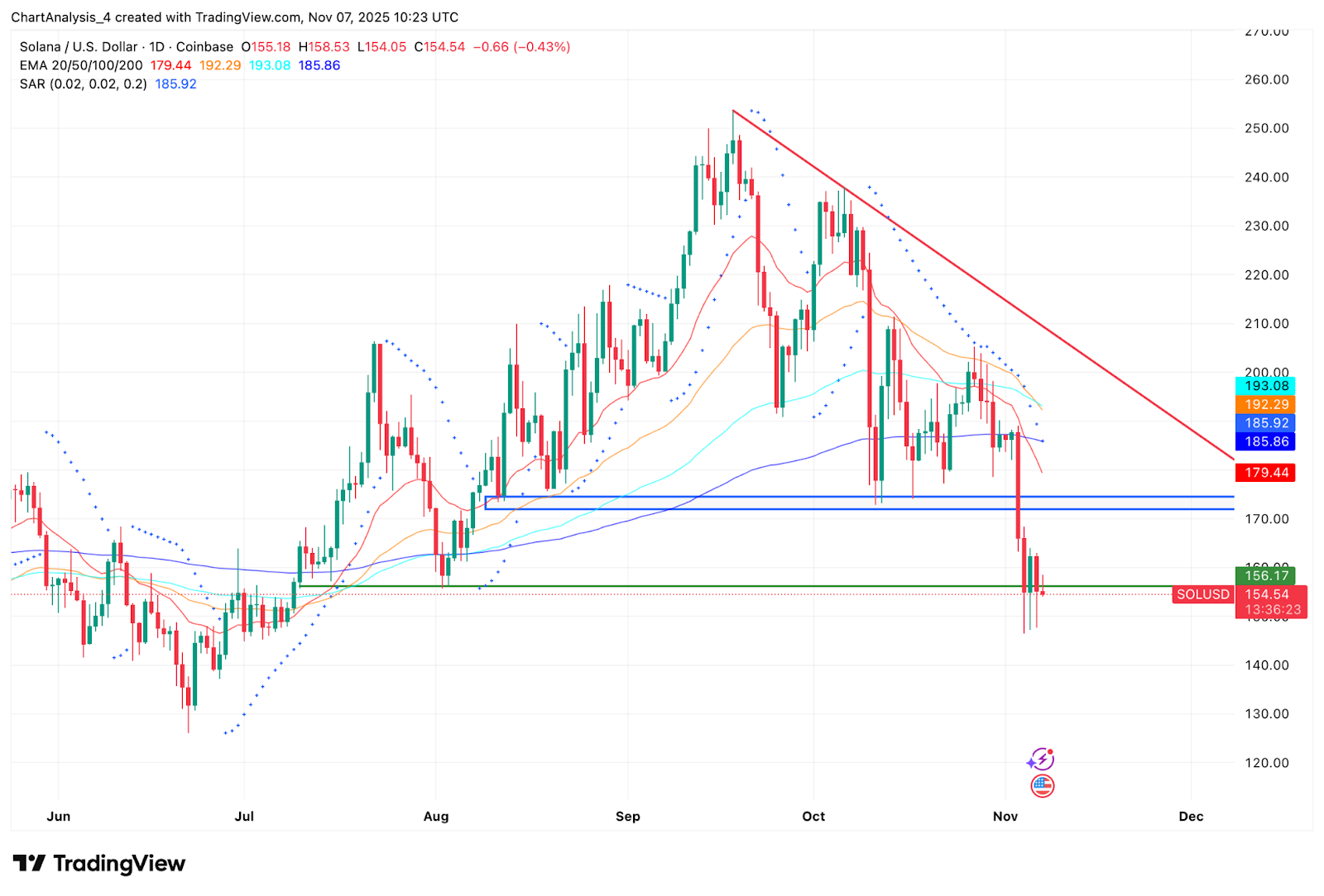 The daily chart shows Solana failing to reclaim the 20 day, 50 day, and 100 day EMAs. All three are stacked downward and reinforcing the descending trendline from the October peak. The EMA cluster around $185 to $192 now acts as a heavy overhead barrier. Any short term bounce faces immediate selling pressure from this zone.