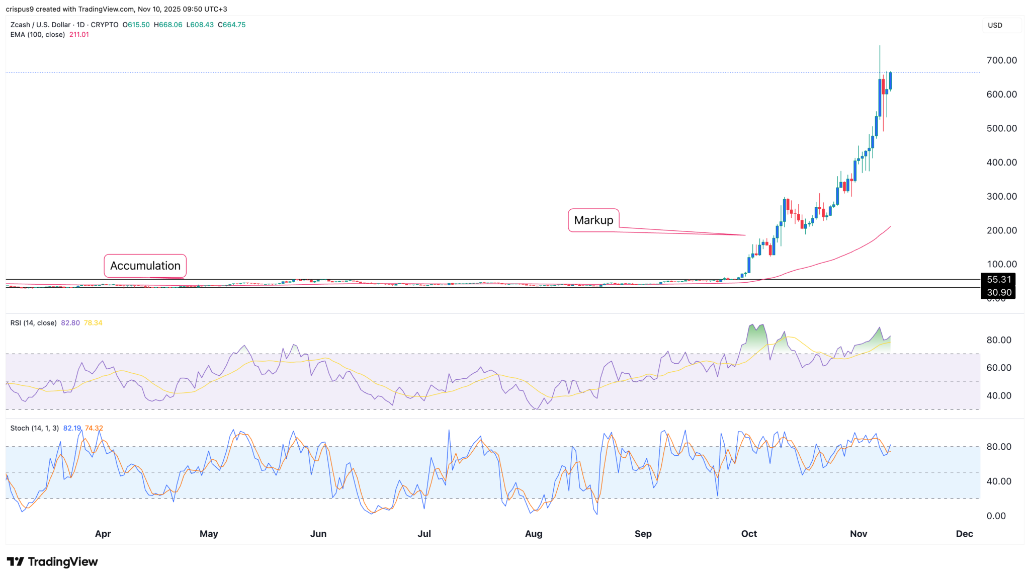 Zcash price has been the best-performing cryptocurrency this year, rising from $30 in August to a high of $740. This surge was driven by the recent launch of a fund tracking the token, which has now accumulated over $150 million in assets.