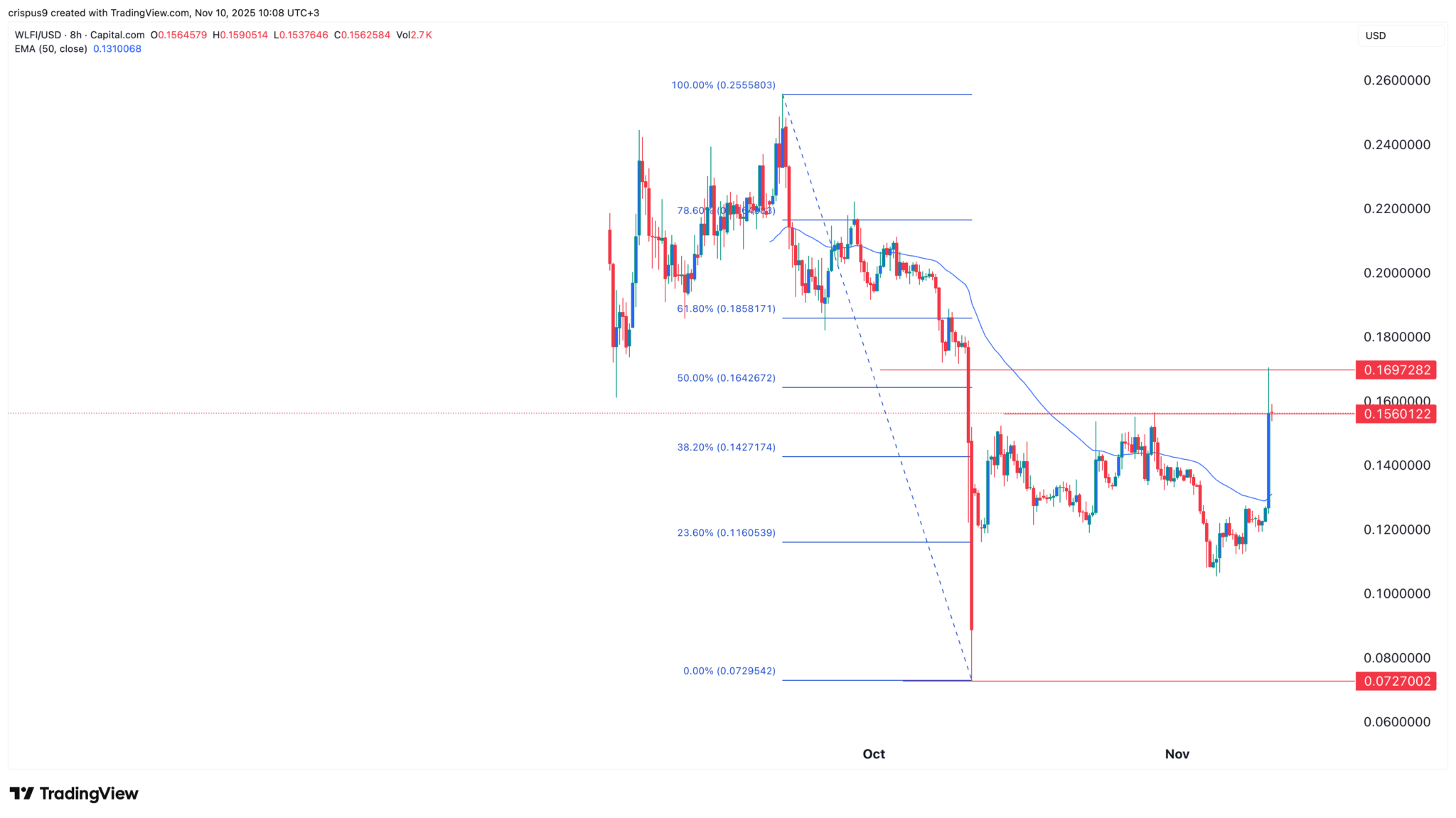 The World Liberty Financial token has been in a strong uptrend in the past few days, moving from a low of $0.072 on October 11 to a high of $0.1697 today. It has jumped to the highest level since October 10.