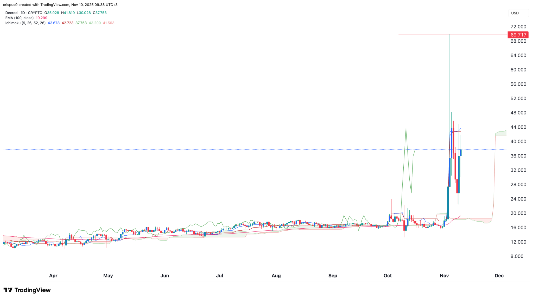 Decred price then plunged to $22 on November 8 and has now rebounded to the current $37. It has moved above the 50-day and 100-day Exponential Moving Averages (EMA), a sign that bulls remain in control.
