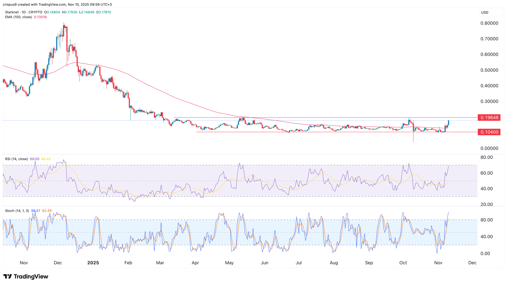 Starknet price rose as it remains in a tight range between the support and resistance levels at $0.1040 and $0.1965. There are signs that it is in the accumulation phase of the Wyckoff Theory, which may trigger a strong bullish breakout, potentially to the psychological level at $0.50.