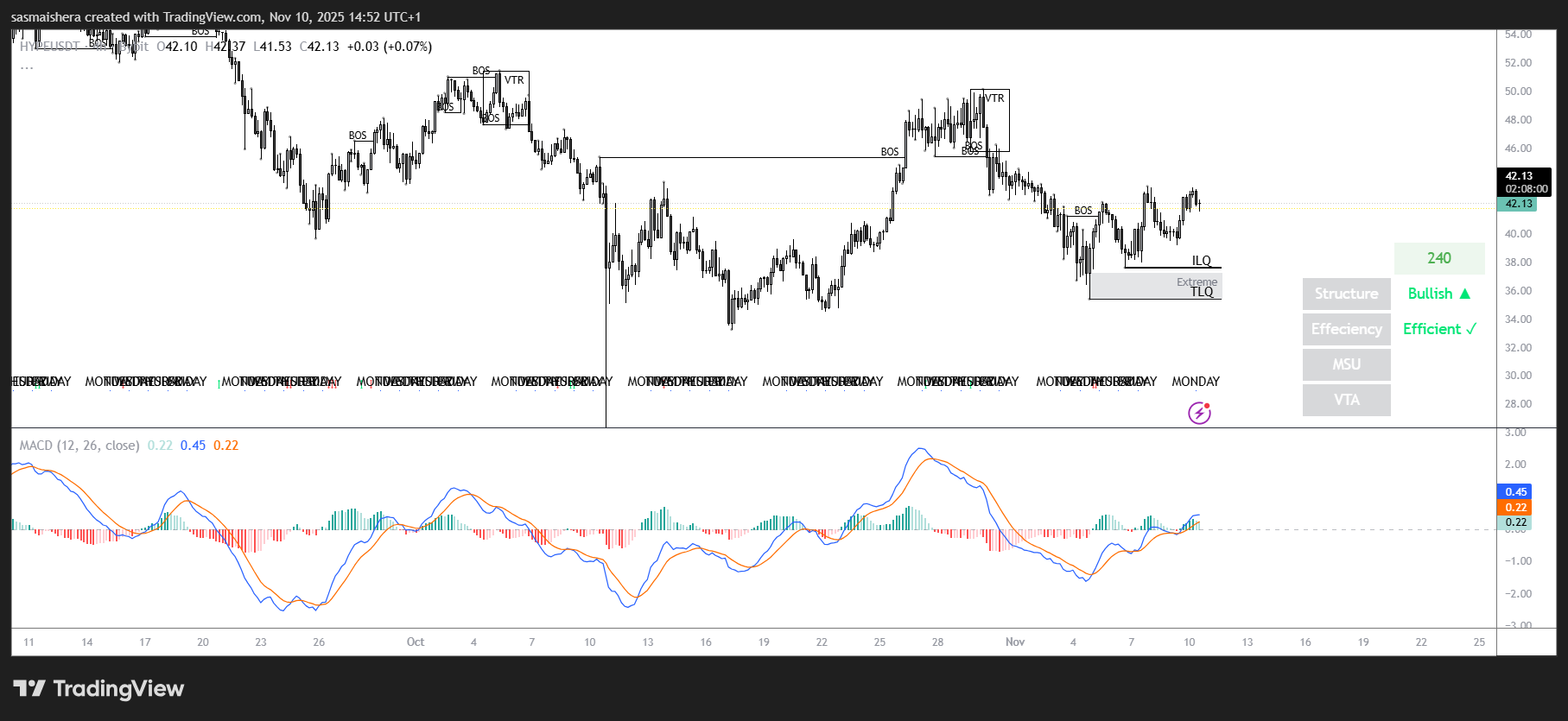 Currently, HYPE is trading below the confluence of the 50-day and 100-day Exponential Moving Averages (EMAs) at around $42.