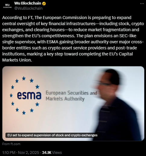 Risk assets caught a bid after the Senate advanced a bipartisan funding package to end the record-long government shutdown. Polymarket odds now show an 87% chance the shutdown ends by Nov. 15, which would restore critical data flow after two straight months of jobs and CPI blackouts. The news was particularly welcome for BTC, which had been struggling around the $100,000 mark all week and was down -10% before bouncing on the headlines. While the bill still needs House approval and Trump’s signature, markets are taking the procedural progress as the main risk-on catalyst, lifting global equities and futures.