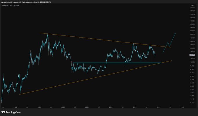 Easton, on November 9, highlighted a symmetrical triangle forming over the past two years, highlighting the compression between rising support and falling resistance, which often precedes explosive upward moves.