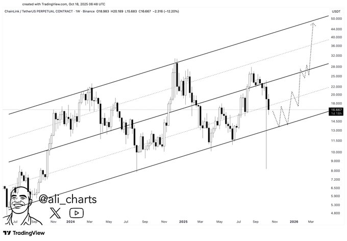 Ali identifies the $14 launchpad support zone as a critical retracement level capable of spurring medium-term rallies toward $50 if buying pressure increases.