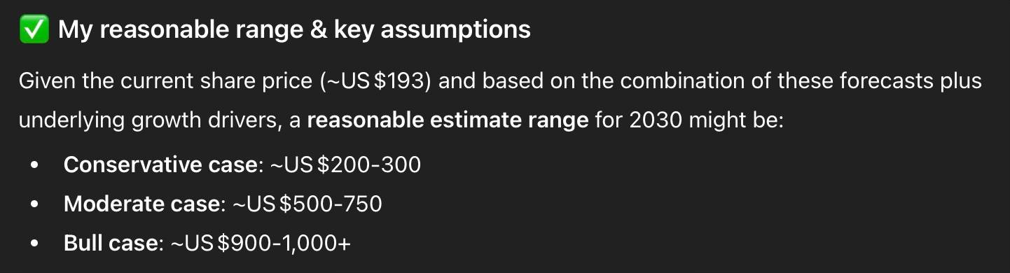 Looking even further ahead, ChatGPT believes such predictions are more than likely, as it thinks a more conservative case would see Nvidia shares trading in a $200–$300 range by the end of the decade, while a moderately bullish scenario would see it double that figure and land somewhere in the $500–$700 ballpark.