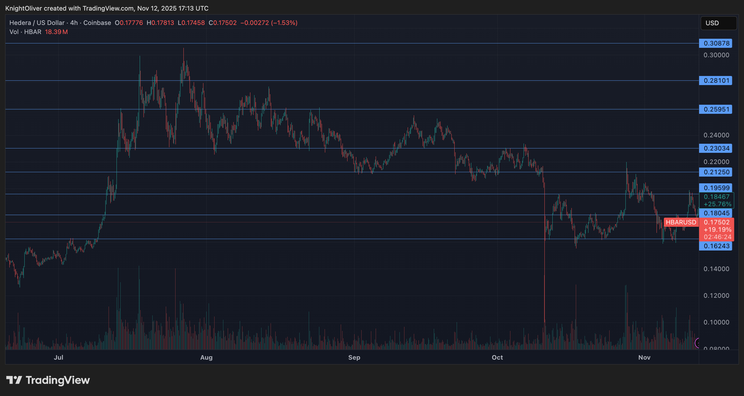HBAR slipped 0.6% to $0.1849 in Tuesday’s volatile session, testing the lower boundary of its recent trading range.