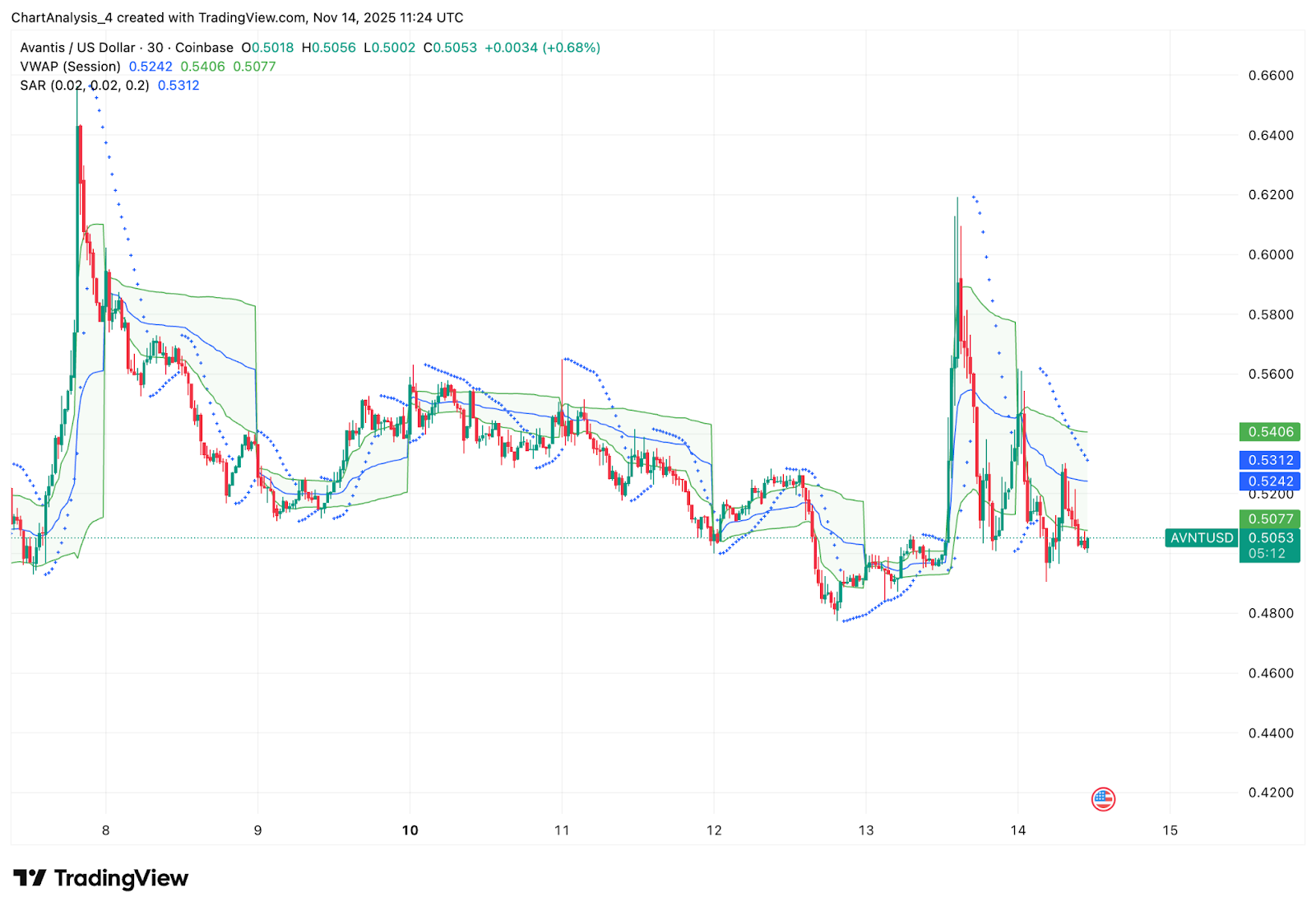The 30 minute chart shows AVNT trading inside a tight compression range after yesterday’s volatility. Price is oscillating near the VWAP band around $0.507, but buyers have failed to reclaim the mid band near $0.524.