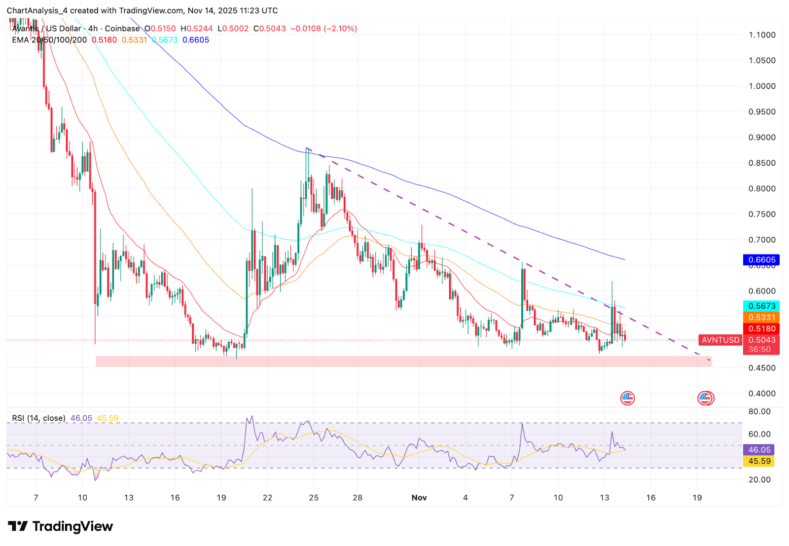 Avantis price today trades near $0.505, slipping after another rejection at the descending trendline that has capped every rally this month. The token continues to coil inside a narrowing structure, but flows remain negative and the EMA stack sits firmly above price. This keeps sellers in control as AVNT approaches a major demand zone.