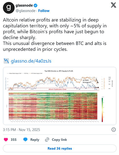 The altcoins market is reportedly entering a deep capitulation zone. As a result of this, just 5% of the total altcoin supply is in profit. As per the data from Glassnode, this prolonged capitulation occurs at a time when Bitcoin ($BTC) is witnessing a newly started sharp decline in profits. Hence, this outlook highlights a notable divergence in the current crypto market cycle.