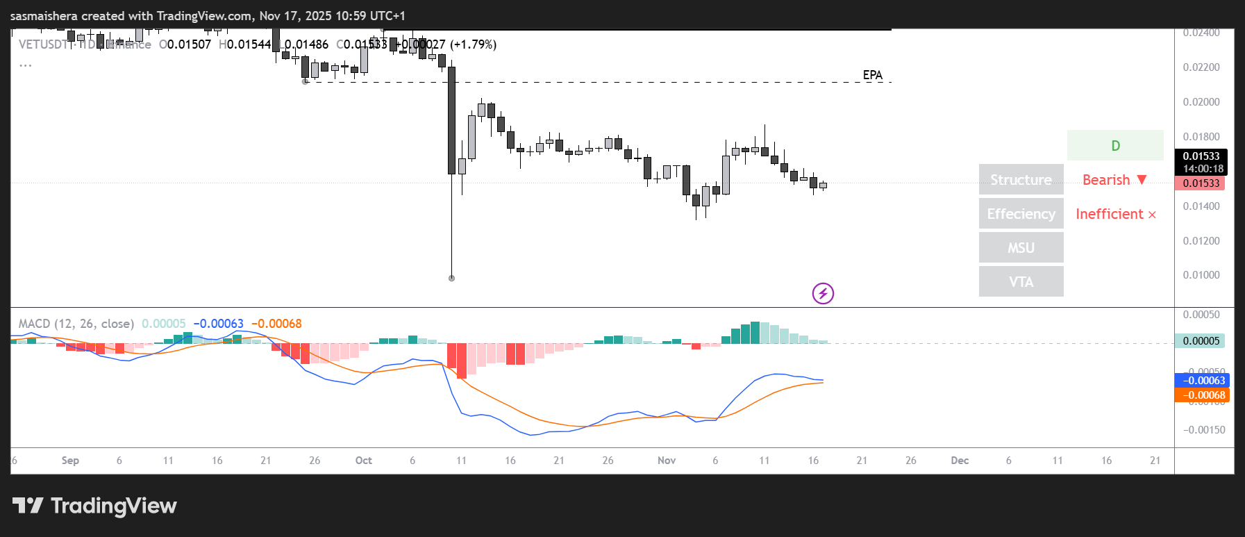 The VET/USDT daily chart is bearish and inefficient as VeChain has failed to recover since the October 10 liquidation event.