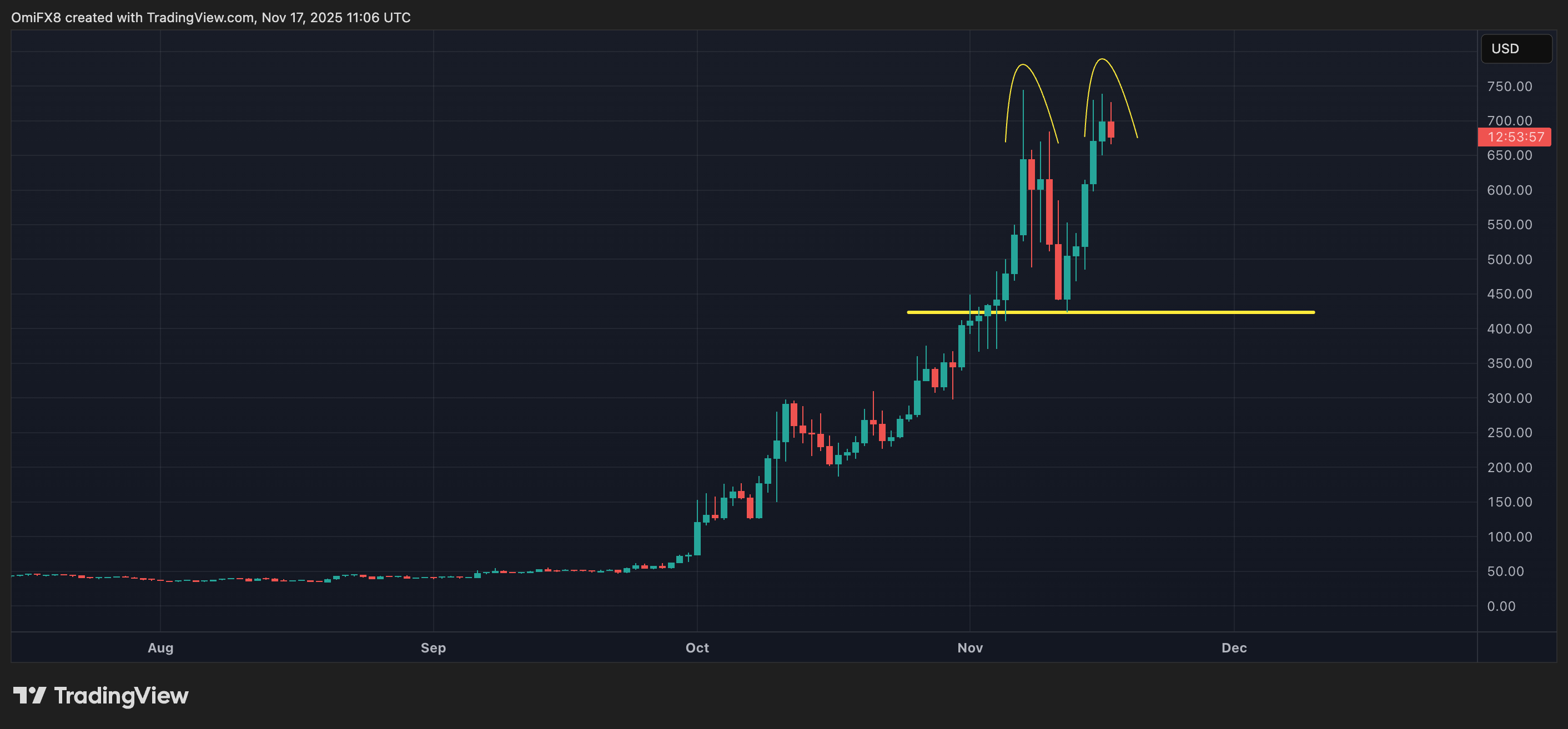 - That has raised the risk of a potential formation of a double top pattern, with the neckline support at $423, shown by the horizontal line.