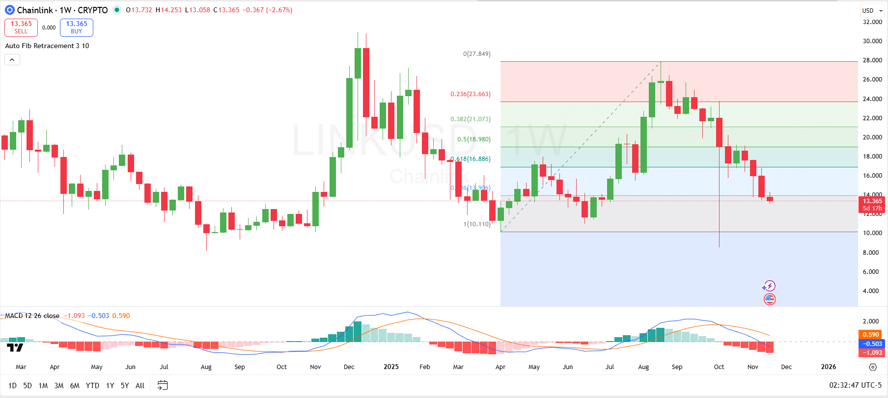 Looking at Chainlink’s weekly chart, the crypto asset still faces a bearish trend, with the price struggling to hold above key support levels. The Fibonacci retracement levels show that LINK has tested the latest support around the 0.786 level at $13.91 and broke below it.