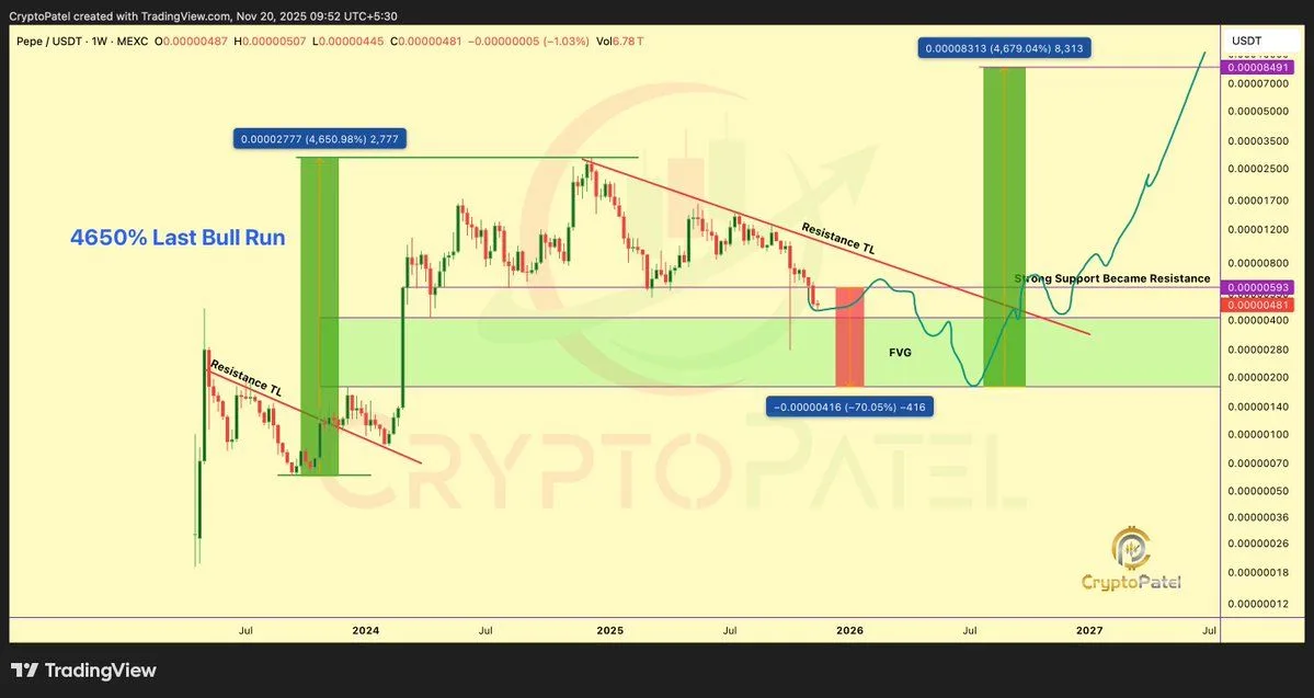 However, the structure is not bearish forever. The idea here is that a sharp 40–70% flush would complete Smart Money Accumulation inside that lower zone. After that, a clean reclaim of $0.0000059 on the weekly chart would mark a macro bullish shift. The last time PEPE formed a similar pattern and broke a descending trendline, it later delivered about 4,650%, so the analyst treats this drawdown as preparation for the next expansion rather than the end of the trend.