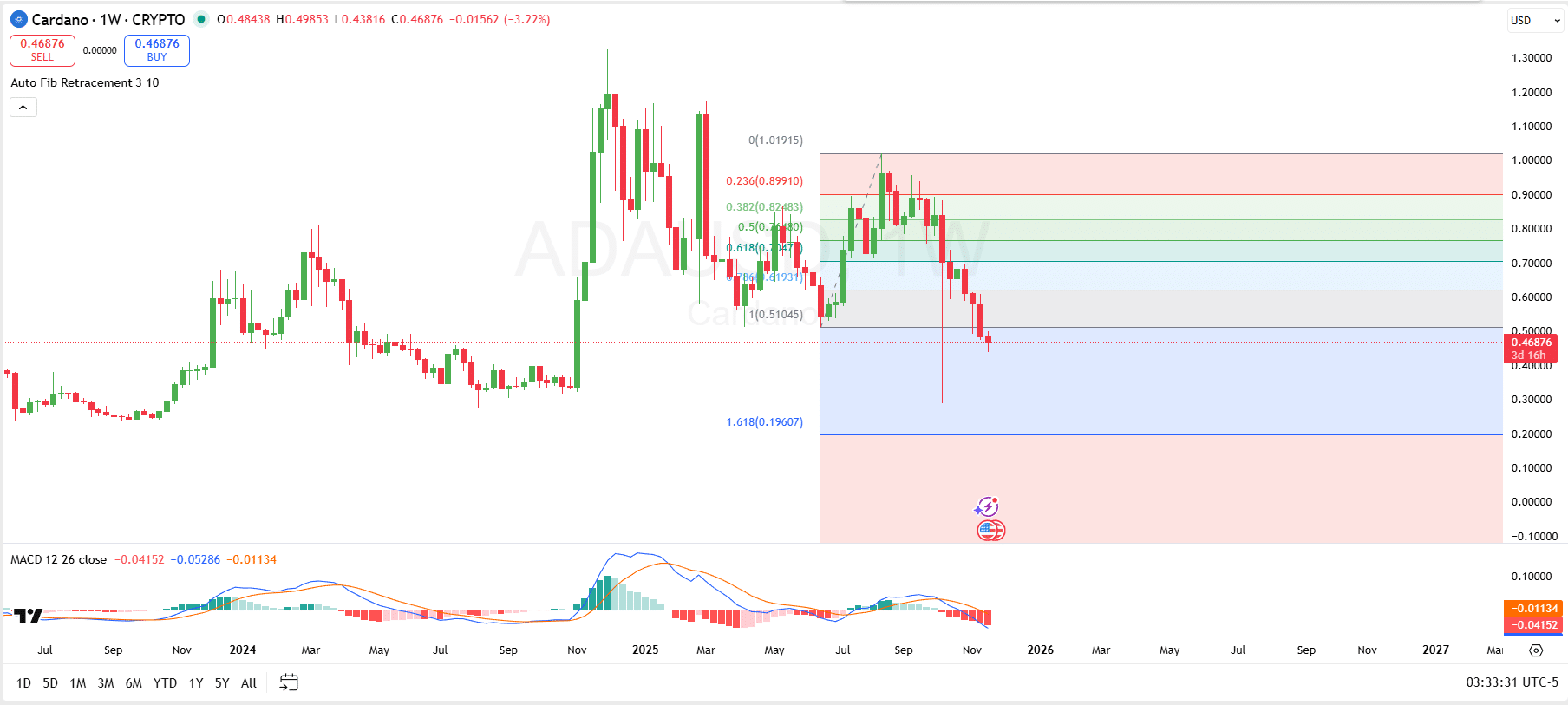 On the other hand, the 1 retracement level, positioned around $0.5105, has flipped into resistance, as the price has already fallen below it. Above that, the 0.786 retracement level at $0.6193 and the 0.618 level around $0.70 are important areas to watch, providing resistance zones that ADA bulls must break through.