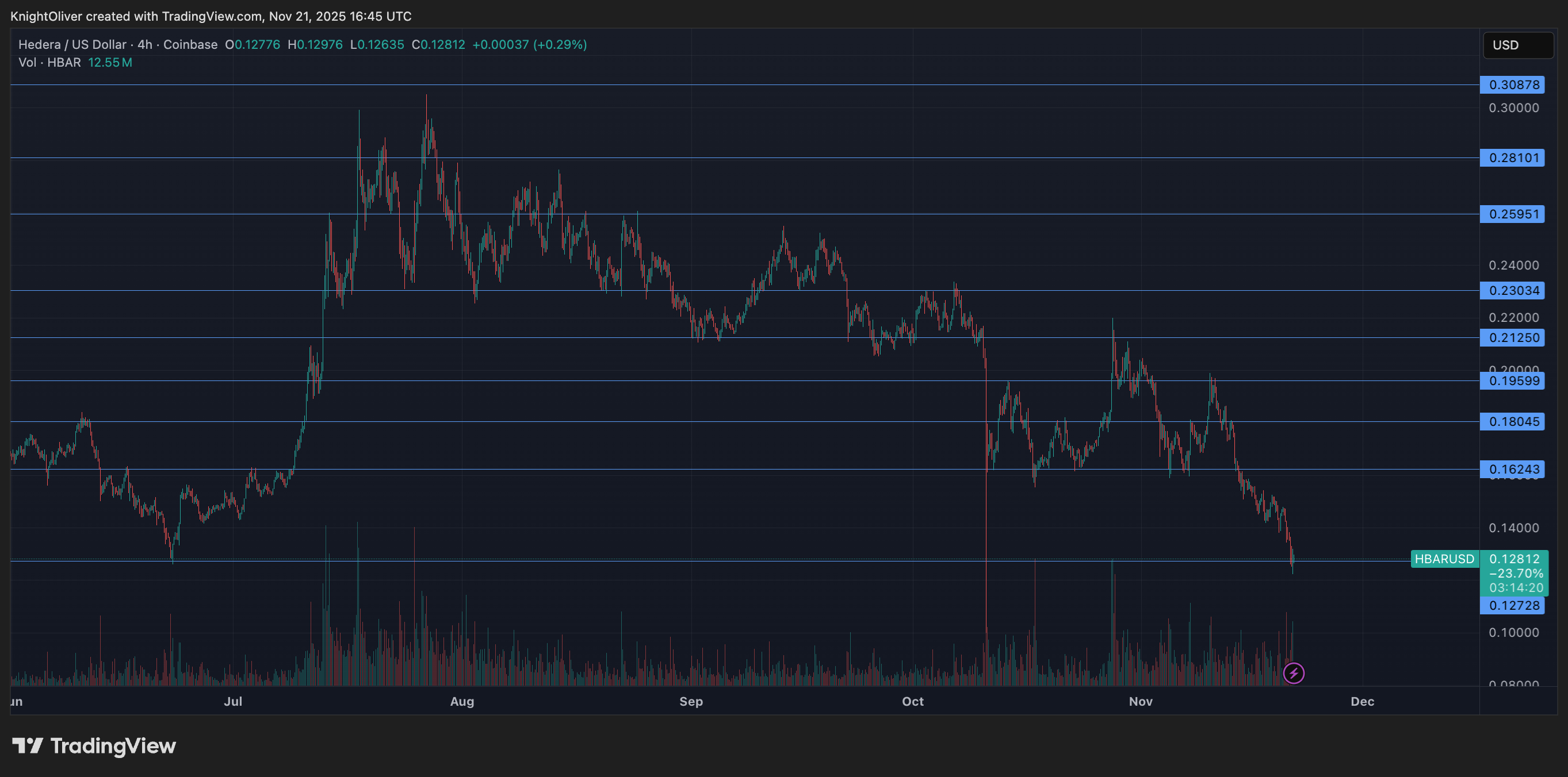 The rout deepened as HBAR logged consecutive lower highs and heavier volume with each leg down, repeatedly testing the $0.1277 zone. With resistance now firm at $0.1400, market structure has tilted decisively bearish, reflecting broader crypto-market weakness. Tuesday’s failed defense of $0.1350 became the central turning point, highlighting how institutional positioning dictated price action.