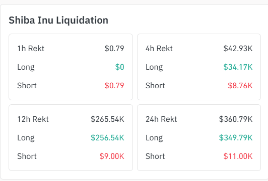 Meanwhile, the liquidation data for SHIB shows significant bearish pressure, with long positions facing heavy liquidations across multiple time frames. Over the past 12 hours, long liquidations have totaled over $265.54K, suggesting widespread selling as traders react to downward price movement. This reinforces the sentiment of caution among traders, indicating a potential continuation of the downtrend.