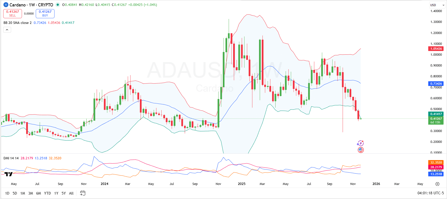 On the weekly Cardano chart, Bollinger Bands highlight how aggressively the trend has turned lower. Specifically, ADA is trading below $0.41, almost exactly on the lower band around $0.414, after sliding from the mid-range just a few weeks ago. The mid-band (20-week simple moving average) is around $0.73, and could serve as an initial resistance zone.