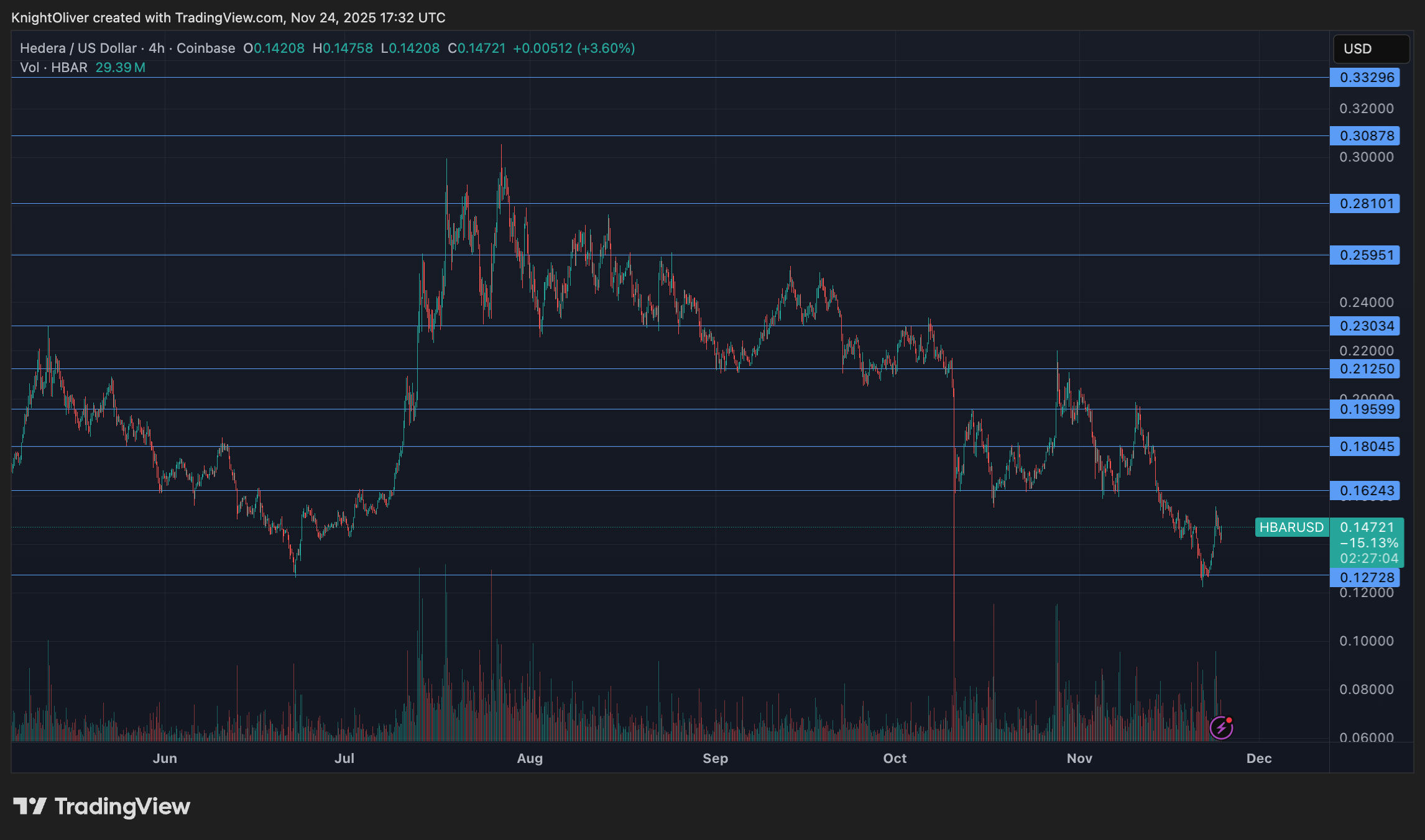 Support formed near $0.1410 as late-session buying stabilized the pullback. Short-term data showed a strong 60-minute reversal pushing HBAR from $0.1413 to $0.1443 on robust volume, reinforcing bullish momentum above newly established support. Still, the broader trend remains heavy, defined by persistent lower highs that have shaped the market since September.