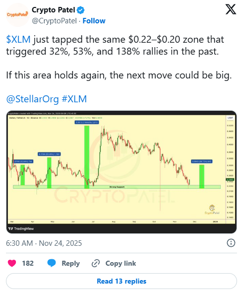 The chart shows that XLM touched the support area multiple times this year. Each touch formed a sharp upward reaction that created clear short-term rallies. The structure displays three earlier bounces of 32.64%, 53.45%, and 138.64%, which formed shortly after the price reached the same horizontal region.