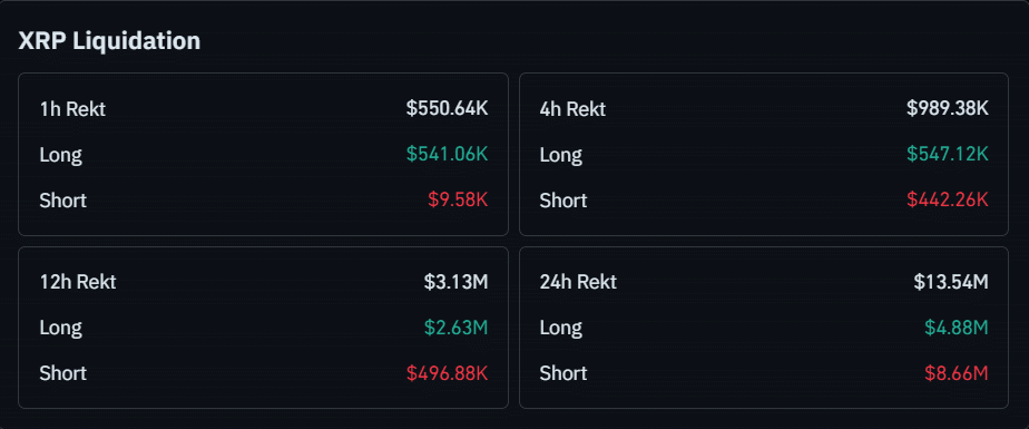 The most telling data appears in the 24-hour period, where XRP saw a massive $13.54M in liquidations. Critically, shorts absorbed the majority of the damage, with $8.66M liquidated compared to $4.88M from longs. Overall, the liquidation profile suggests that bearish traders are increasingly being forced out of their positions.