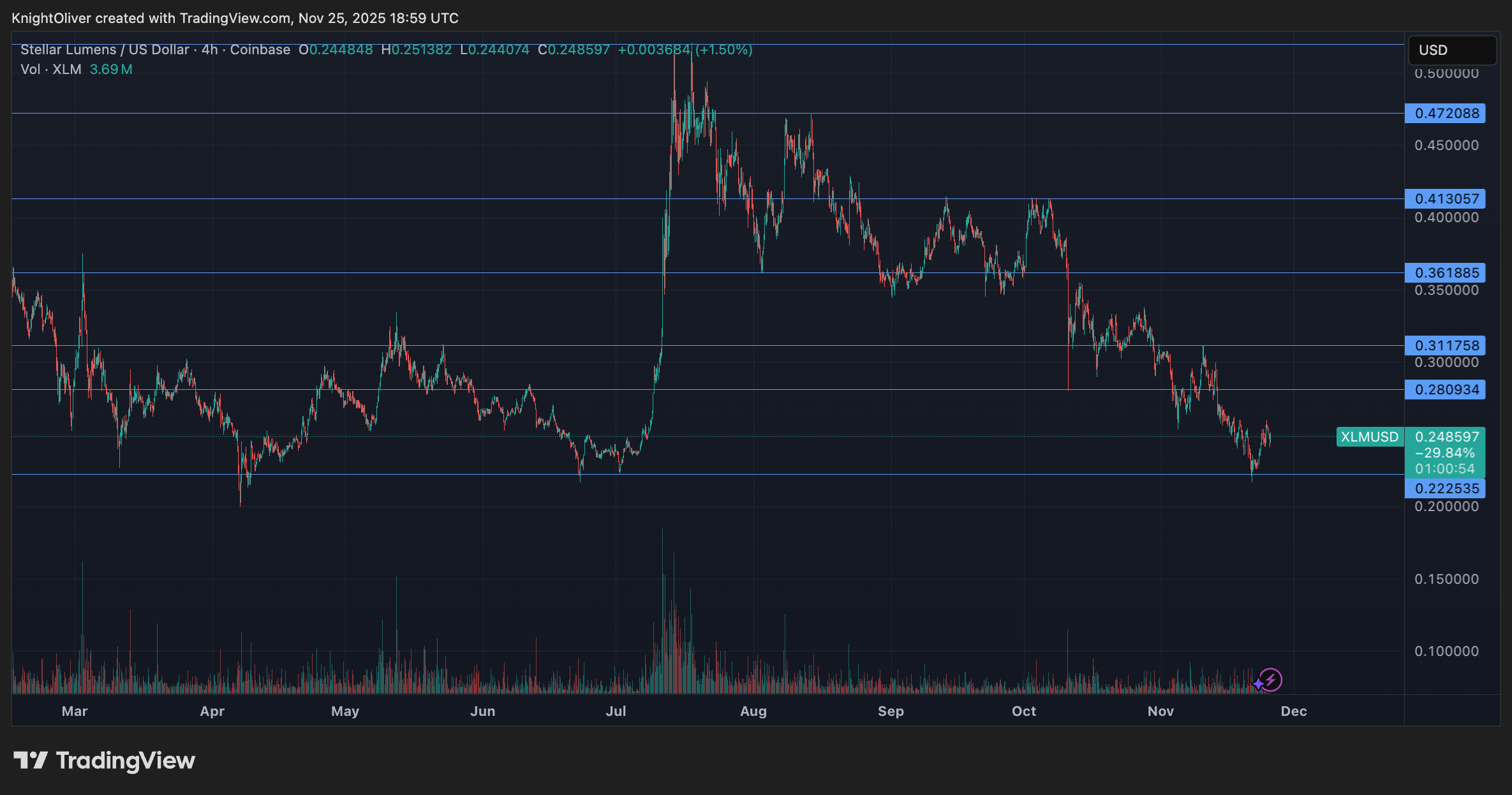 Traders are now watching whether XLM can hold above the former $0.2460 ceiling, a level anchoring the broader $0.22–$0.24 support zone that previously produced triple-digit rallies.