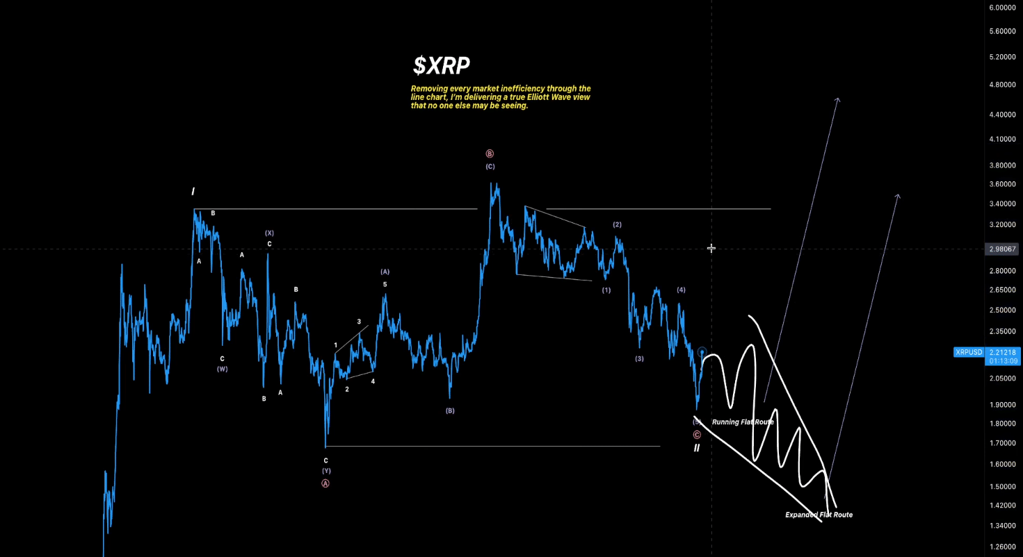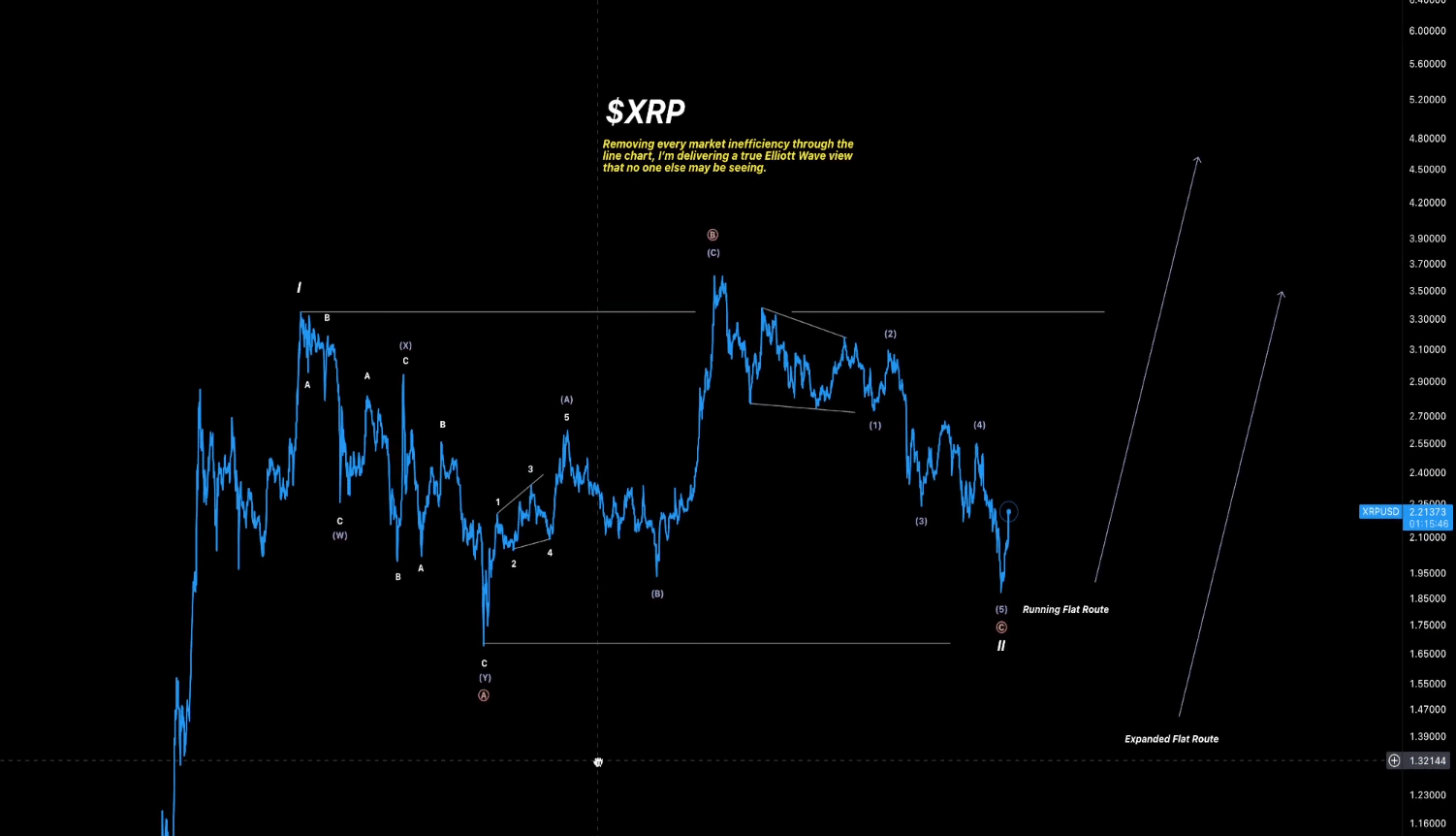 XForceGlobal suggested that this range was a sign of upward accumulation rather than weakness. The line chart also helped him confirm that XRP still completes a larger flat pattern and that the final C-wave needs a full five-wave structure before the market can move higher.