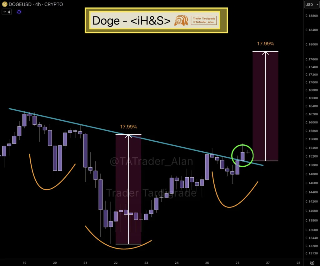 Another chart shows an even stronger bullish pattern: a fully developed inverse head-and-shoulders with a diagonal neckline. DOGE broke above that neckline at roughly $0.152, circled on the chart, activating a projected 17.99% upside target that places potential continuation near $0.176–$0.180.