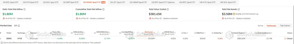 While REX-Osprey previously launched a Dogecoin ETP in Europe, GDOG becomes the first spot DOGE vehicle to enter the U.S. market. Bitwise is also set to begin trading its Dogecoin ETF today, following the end of the U.S. government shutdown, which had paused approvals.