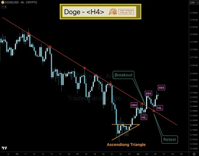 The chart highlights a long series of lower highs pressed against a falling red trendline. DOGE eventually broke through that trendline, retested it, and bounced, confirming a structural shift. Price then printed consecutive HHs and HLs between $0.14 and $0.15, suggesting buyers are gradually reclaiming momentum.