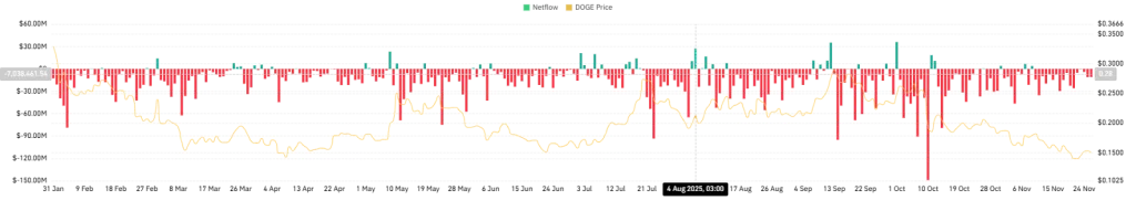 Despite the short-term relief, larger timeframes still show persistent weakness. DOGE remains down 5% on the week and 27% over the past 30 days, according to CoinMarketCap. Even so, the defense of $0.14 marks one of DOGE’s stable accumulation points, appearing for the first time since the latest downtrend began.
