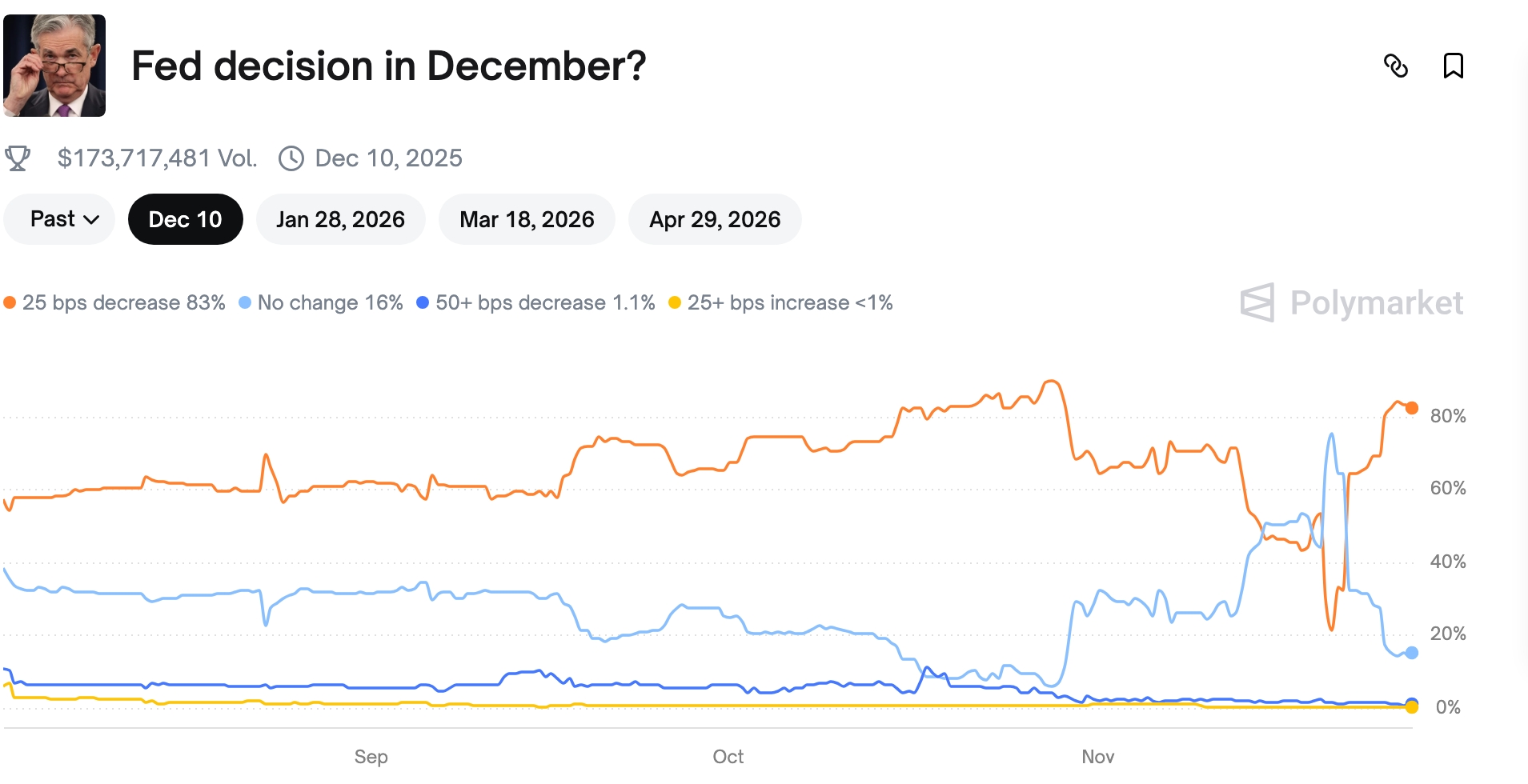 Hassett has been on Team Trump for years and has actively supported cutting interest rates, a move that he will champion as the head of the Federal Reserve. Indeed, Polymarket odds on interest rate cuts have surged to over 83% in the past few days.