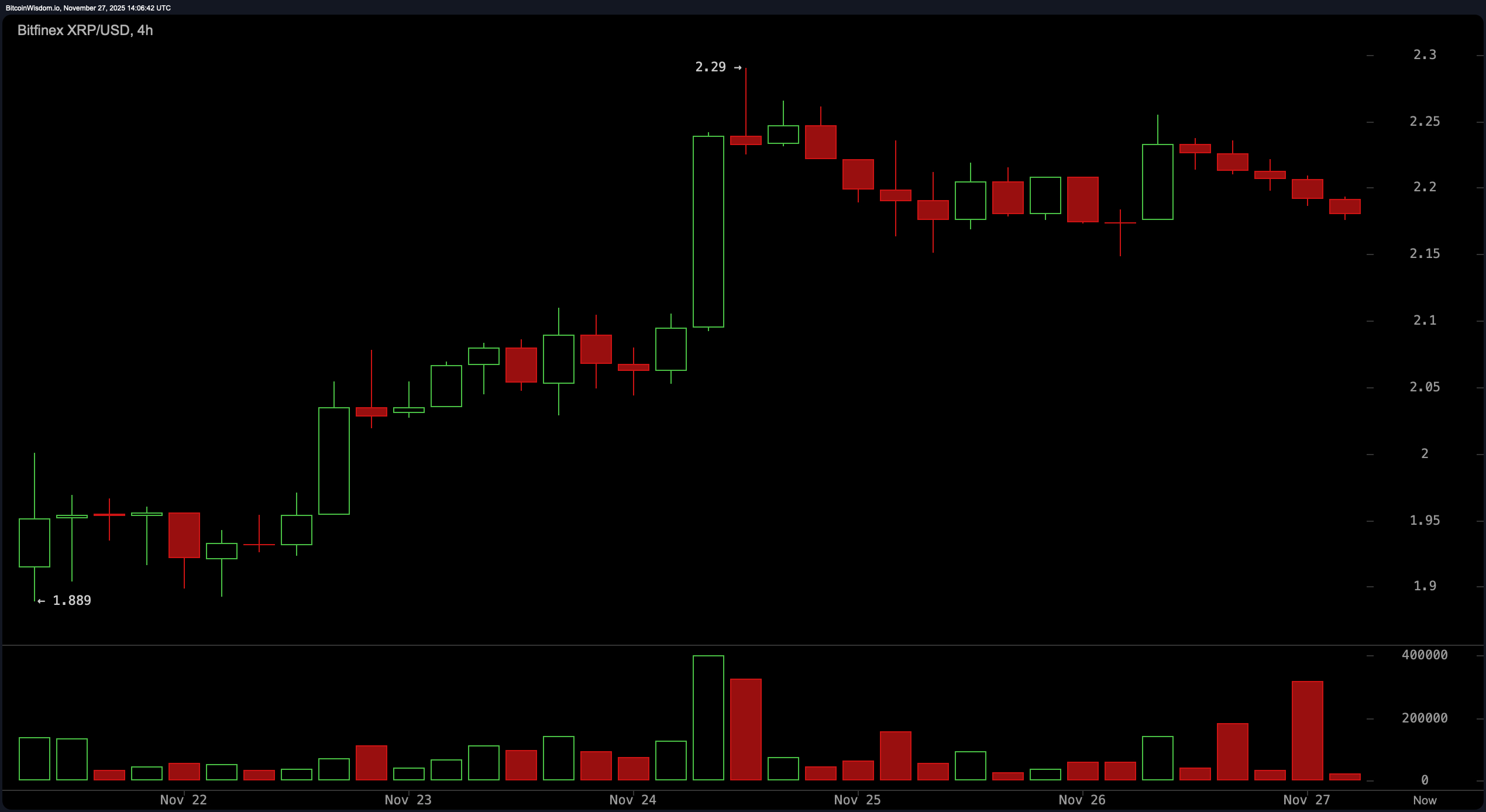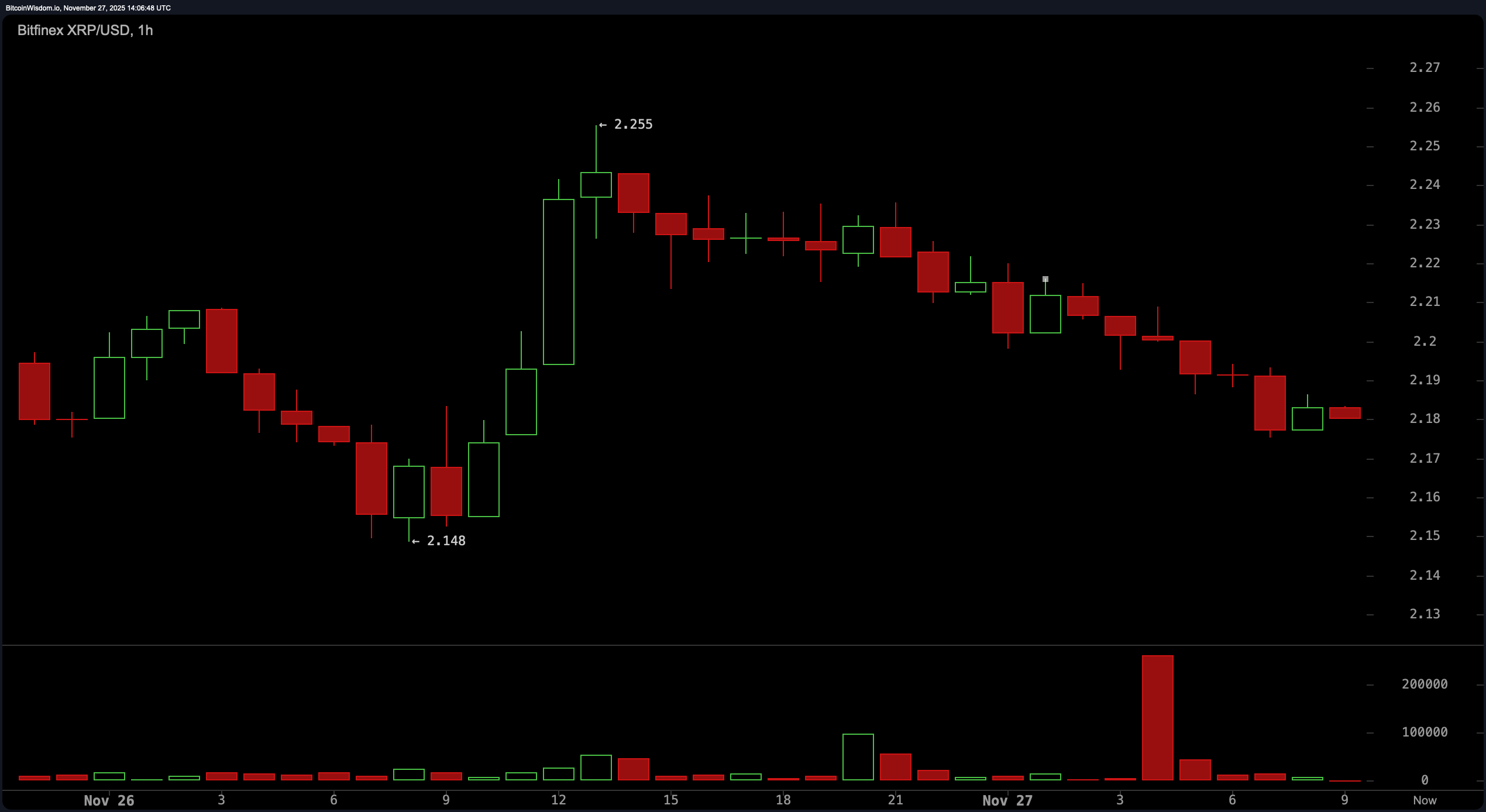 XRP’s broader structure on Nov. 27, 2025, reflects a market trying to shake off a corrective downswing while negotiating stubborn resistance zones across the higher time frames. The daily chart still carries the imprint of a downtrend, marked by lower highs extending from the $2.70 region and the capitulation low at $1.827, though a recovery back into the $2.20–$2.25 pocket suggests traders aren’t entirely ready to roll over.
