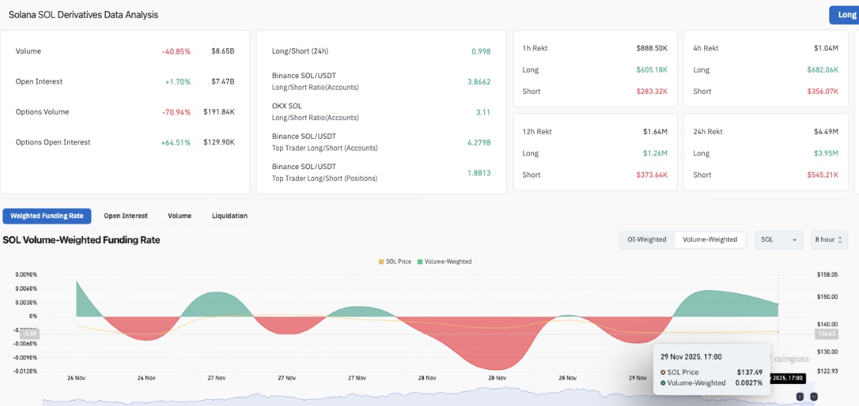 Resilience from bull traders cushioned the downside impact, with Coinglass data showing Solana open interest rising 1.7%, even as SOL price dipped 1.25% intraday in the spot markets. This indicates that speculative traders added $12.5 million in notional leverage to defend the $135 price support level.