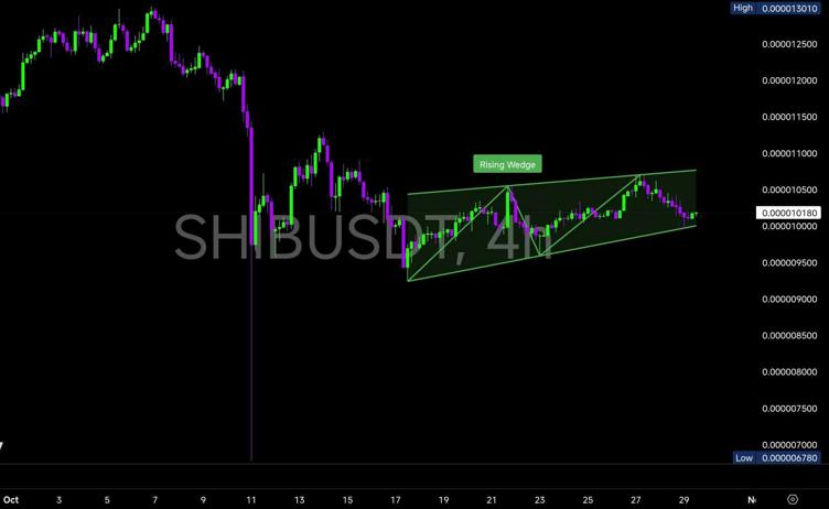This area reflects a possible move of around 40% from a breakout point near the upper trendline. The wedge structure shows a series of attempts to break upward, each followed by weaker bearish continuation, which suggests sellers are losing control.
