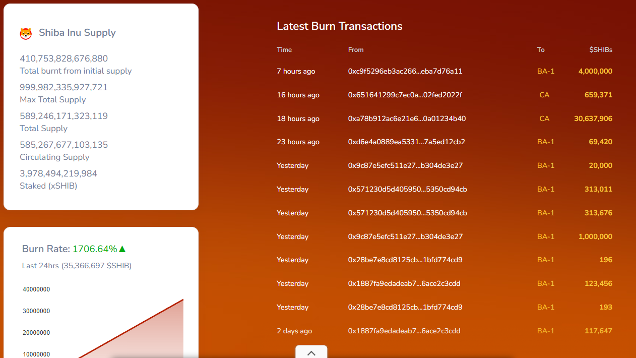 Burn activity has also spiked sharply in the short term. The dashboard shows a burn rate up 1,706.64% over the last 24 hours, with about 35.37 million SHIB destroyed in the past day. Recent transactions include several large burns, such as a 30.6 million SHIB transfer about 18 hours ago and another 4 million SHIB burned seven hours ago, alongside a stream of smaller transactions.
