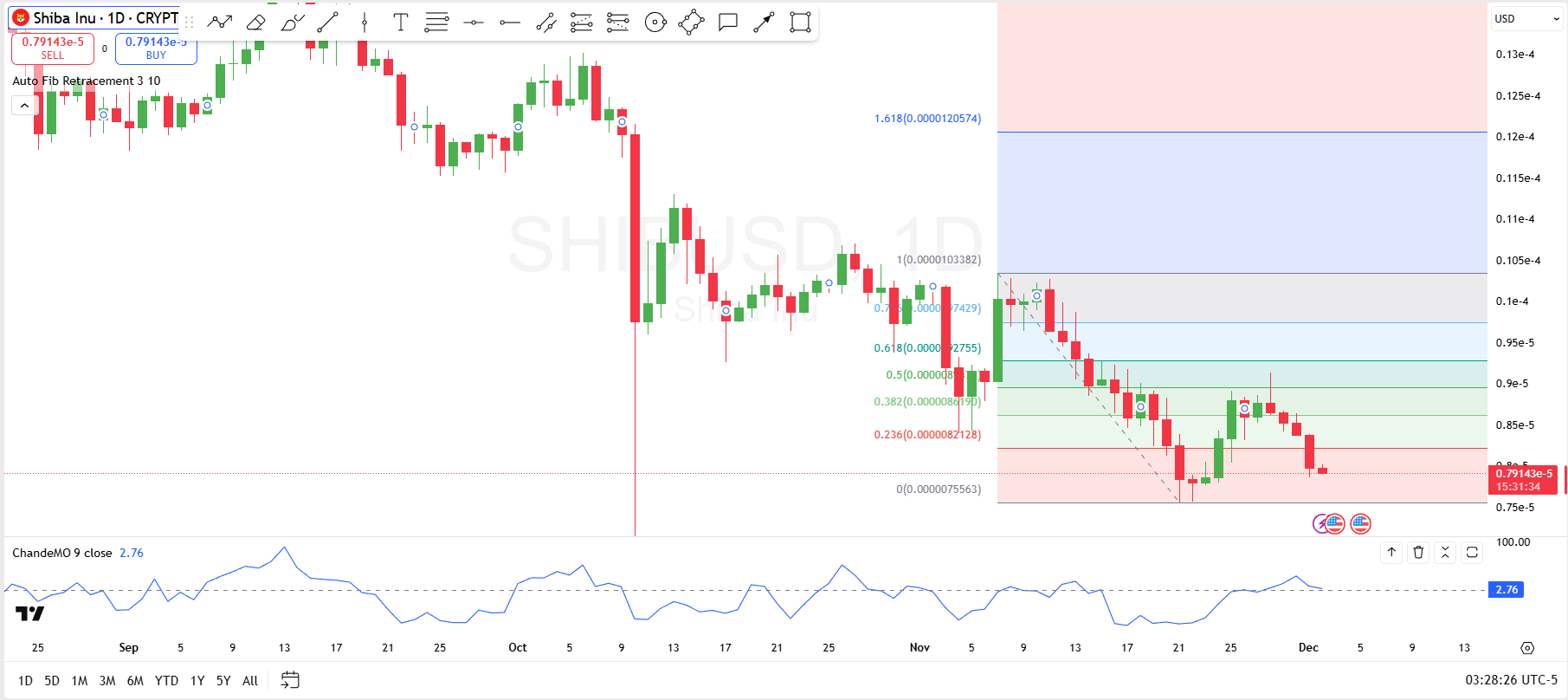 Looking at the technicals, the daily chart shows Shiba Inu locked in a downtrend from the early-November swing high near $0.00001034, with price now trading around $0.0000079. The Auto Fibonacci retracement levels drawn from that $0.00001034 high to the recent low at $0.00000756 clearly map out SHIB’s key levels.