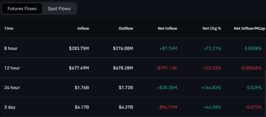 Notably, XRP derivatives data further shows a noticeable shift in futures positioning over the last day. In the past 24 hours, futures venues recorded about $1.76 billion in inflows against $1.72 billion in outflows, leaving a net inflow of roughly $38.35 million and a net change of about +165%.