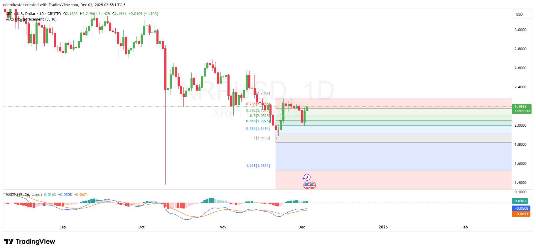 On the technical end, XRP is attempting to stabilize above the $2.10 to $2.20 zone after a recent correction that saw the coin at a bottom around $1.82. The price is now testing the upper band of the 1-day Fibonacci framework.