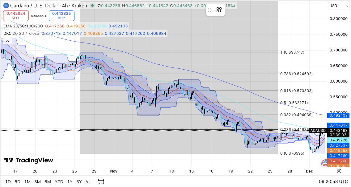Open interest has risen steadily from late October into December. It climbed from around $400 million to more than $760 million. This increase came during a period when ADA moved lower toward $0.43.
