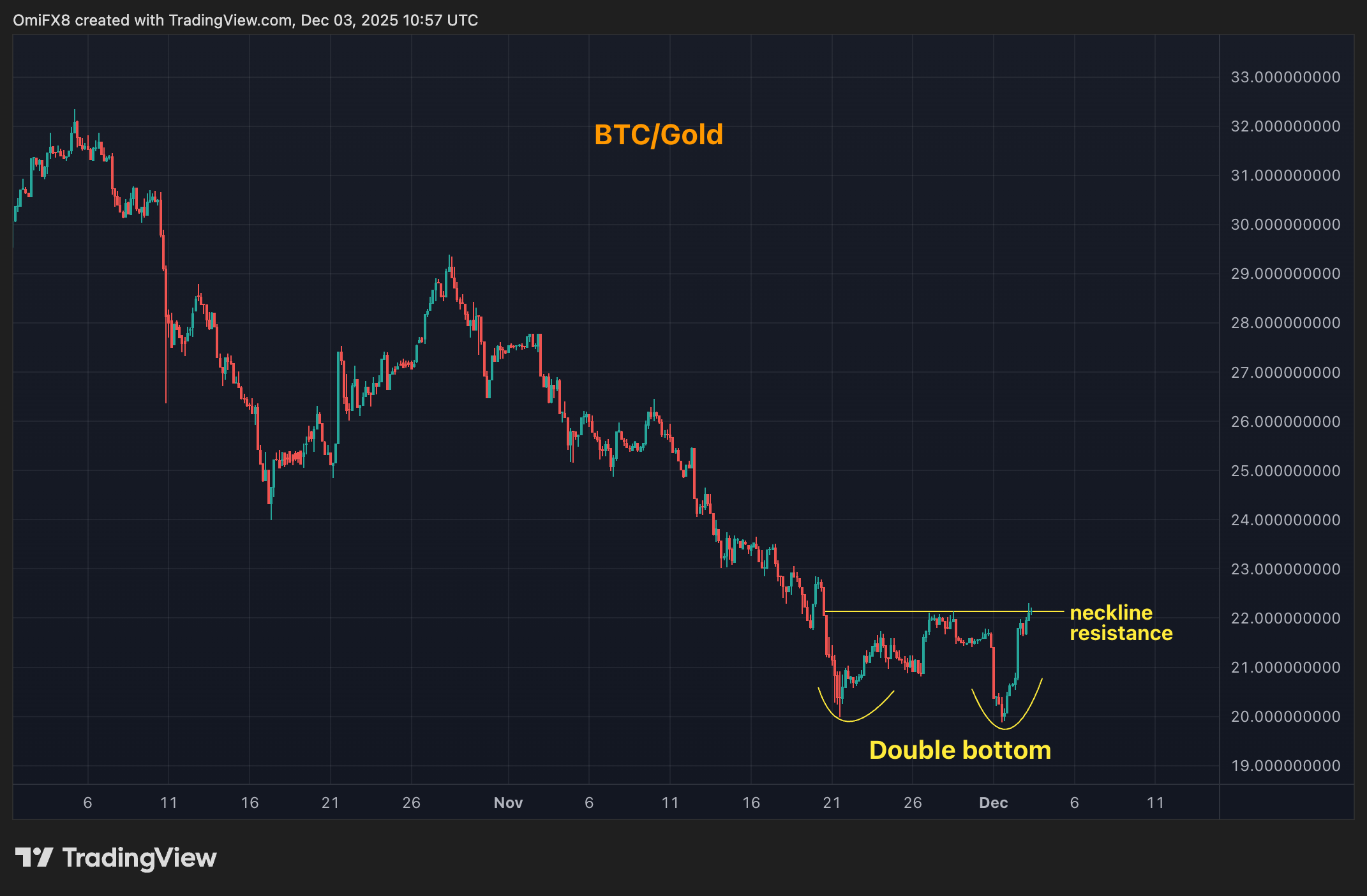 • The ratio has formed a bullish double bottom pattern and probed the pattern's neckline resistance as of writing.