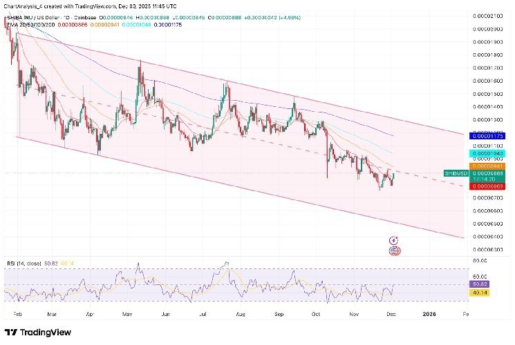 Shiba Inu price today trades near $0.00000888 after a 5 percent intraday recovery that lifted price toward the midline of a long running descending channel. The move gives buyers short term momentum, but the broader structure remains bearish as overhead resistance and weak spot flows limit conviction.