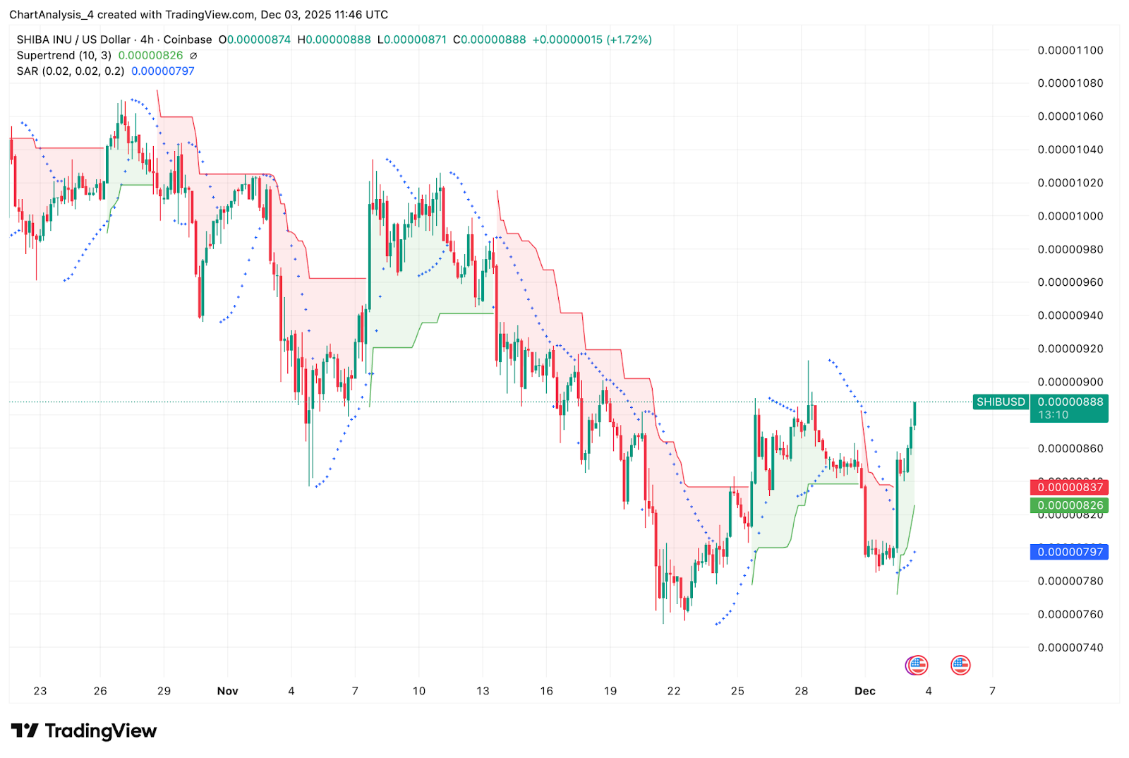 On the 4 hour chart, SHIB has broken above short term Supertrend resistance near $0.00000826. Parabolic SAR dots have flipped below price, signaling a shift in short term momentum. The breakout has been clean but not forceful enough to confirm a structural change.