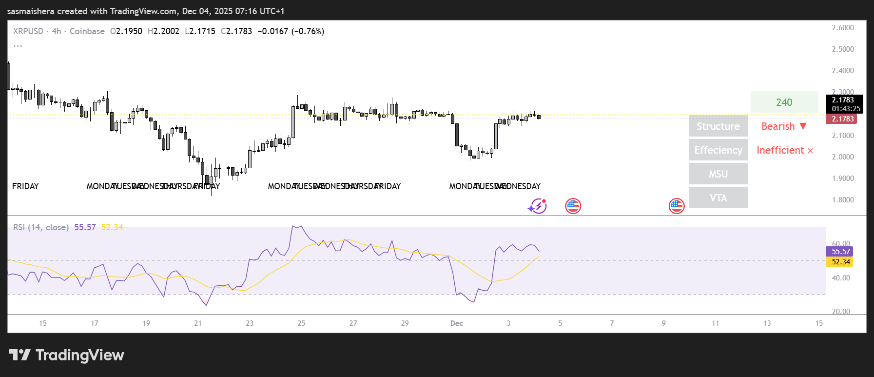 The XRP/USD 4-hour chart is bearish and inefficient as XRP has failed to rally past the $2.2 resistance level over the past few days.