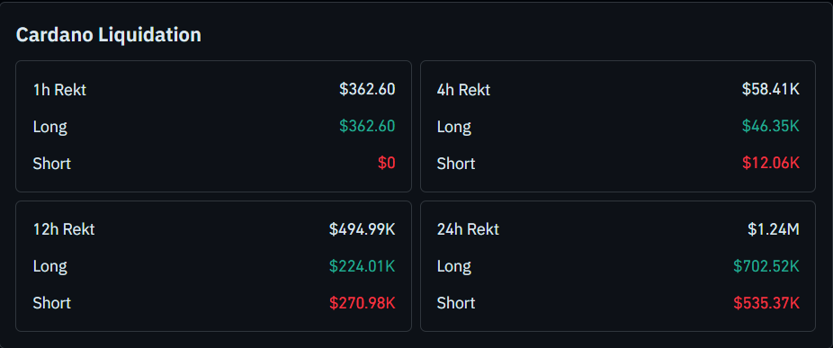 The liquidation data for Cardano provides a snapshot of the current leverage positions and the liquidation pressures in the market. Notably, over the past 24 hours, a total of $1.24 million in Cardano positions faced liquidation, with the majority of the liquidation occurring in long positions ($702.52K).