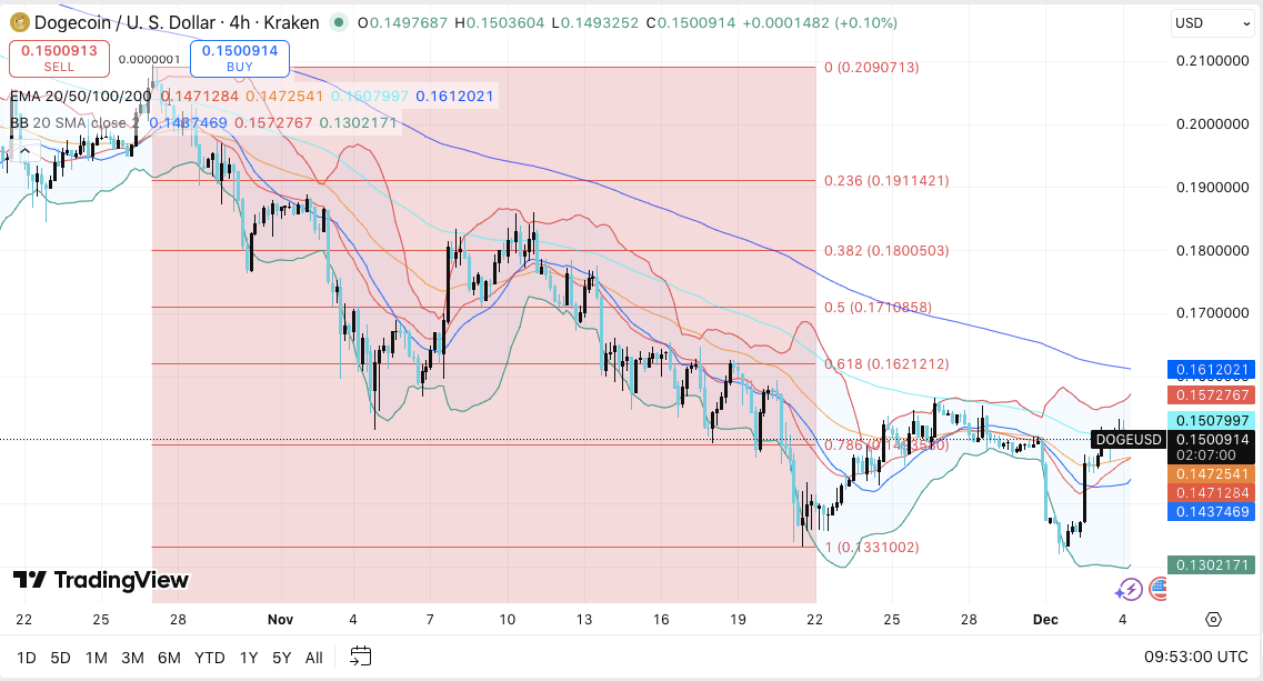 Dogecoin continues to draw attention as the market responds to fresh ETF activity and shifting technical signals. The token attempted a rebound after stabilizing near the $0.133–$0.136 zone, a region that attracted steady buying through early December. Price climbed toward $0.15 as traders assessed the broader trend and weighed new ETF developments.